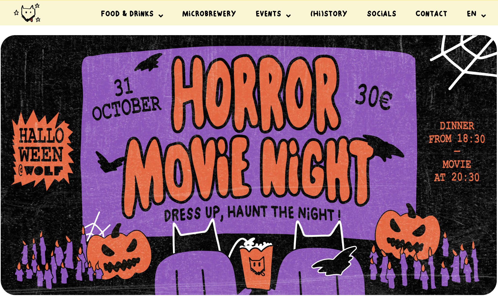 On Halloween night, the Wolf Food Market turns into a movie theatre. Expect haunted decor, jump scares, a food voucher, and naturally, a scary movie. Count me in.