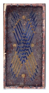 Only three tarot decks from the 15th century have survived to this day. The first and oldest was created for Filippo Maria Visconti, Duke of Milan. Known as the Visconti di Modrone pack, it takes its name from a former owner and doesn’t follow the structure of the modern tarot — a sign that the standard deck had not yet been defined. Eleven trump cards remain, sixty-four cards in total. The originals are now housed at Yale University’s Beinecke Rare Book & Manuscript Library.